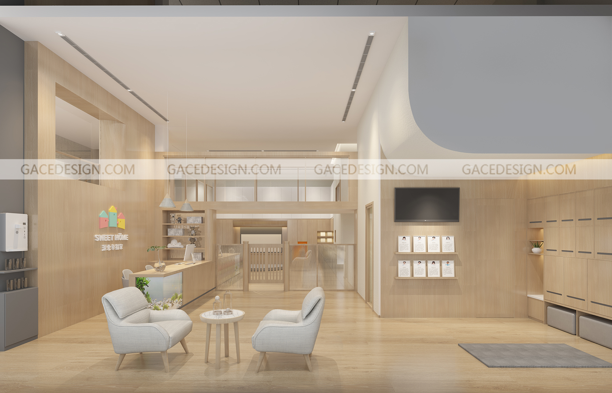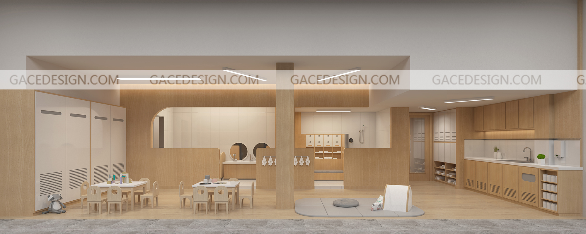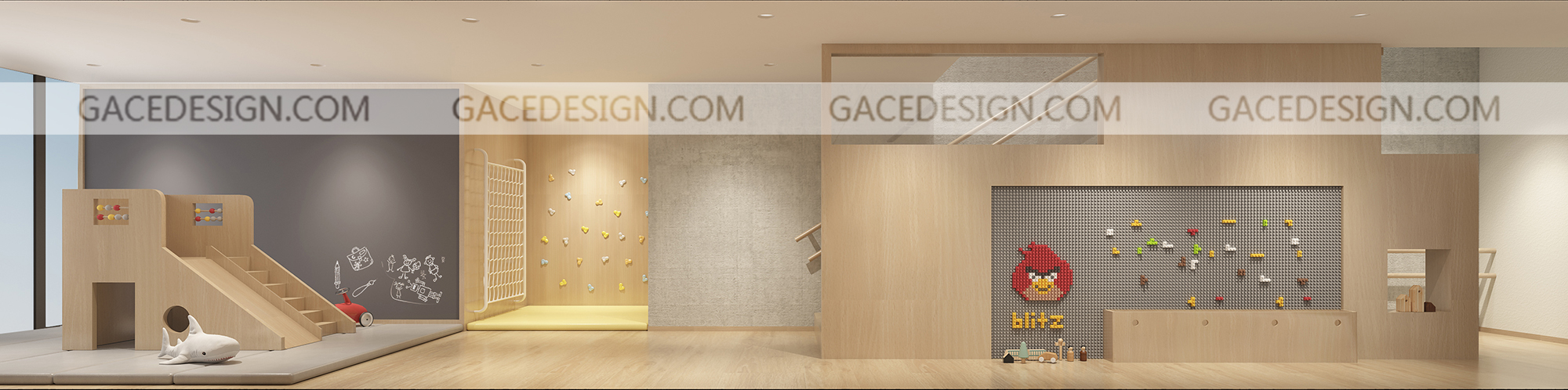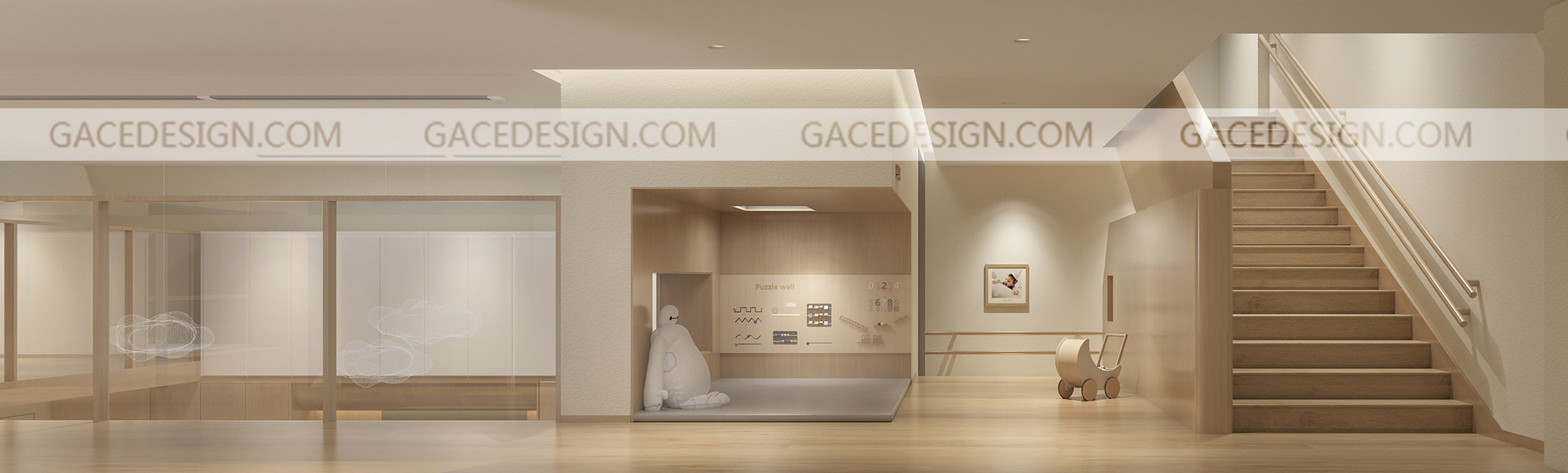 從前廳入口,我們設(shè)置了一個門廳,孩子就像回家一樣,在門廳處就完成了換鞋和洗手的功能,孩子有專屬的換鞋凳和鞋柜。空間造型上我們進行了簡化,保留了原有的層高,讓陽光最大程度的映入空間。在前臺處我們還設(shè)置了孩子尺度可觀賞的魚缸。在空間基調(diào)上我們選擇了柔和木質(zhì)材料與自然光線的映射,使空間呈現(xiàn)明快輕松的氛圍。為了讓孩子自己與環(huán)境互動,我們在一層設(shè)置了一個空曠的空間,孩子們能夠在這里安全的爬行和玩耍,我們根據(jù)不同年齡段孩子的需求還設(shè)置了不同的區(qū)角,益智區(qū)、繪本角、涂鴉墻和感統(tǒng)區(qū)等等。在樓梯閣樓中我們加入了更多可互動性的功能。通過墻上的樂高墻壁,區(qū)域角的閱讀小書屋,攀爬區(qū),滑梯,涂鴉墻。除此之外教室設(shè)計應(yīng)充分的考慮孩子們的尺度和保育員的保育便捷和操作性。我們在項目中嘗試探討空間與兒童的探索關(guān)系。努力營造一種孩子可以自己發(fā)育成長的環(huán)境模式。