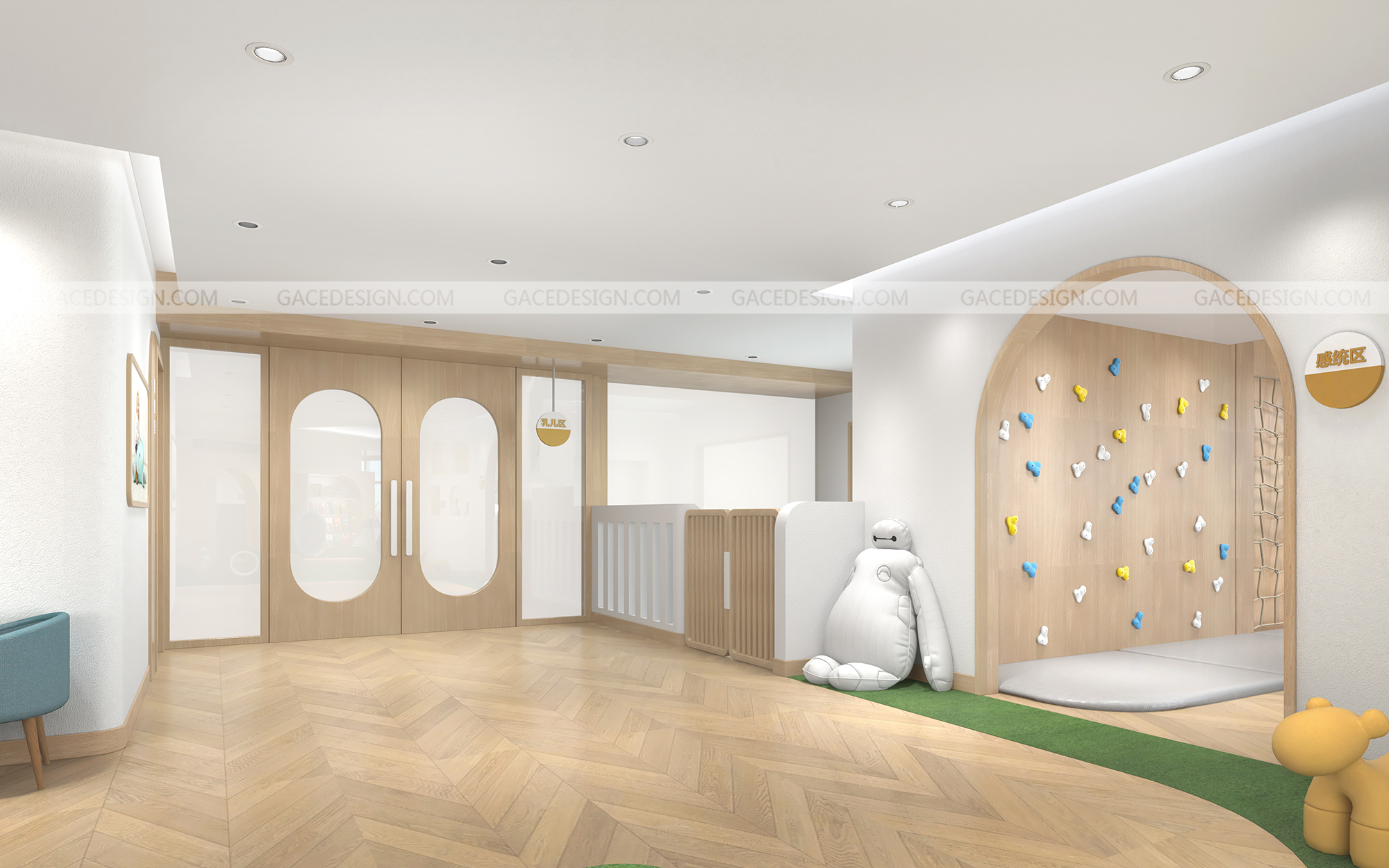 設計思路:通過有溫度感的設計,干凈的空間,但又能夠讓使用者有舒服的體驗,設計不是堆砌造型,應該讓使用者在里面待的狀態可以很放心,溫暖。通過空間里面的大小細節,材質,燈光,人與人之間的眼神和交流而感到幸福。通過具備挑戰性的區域讓孩子們有各種情感上的變化。而且我們在室內設計了一個微縮園林,希望孩子可以與自然環境緊密相連。
