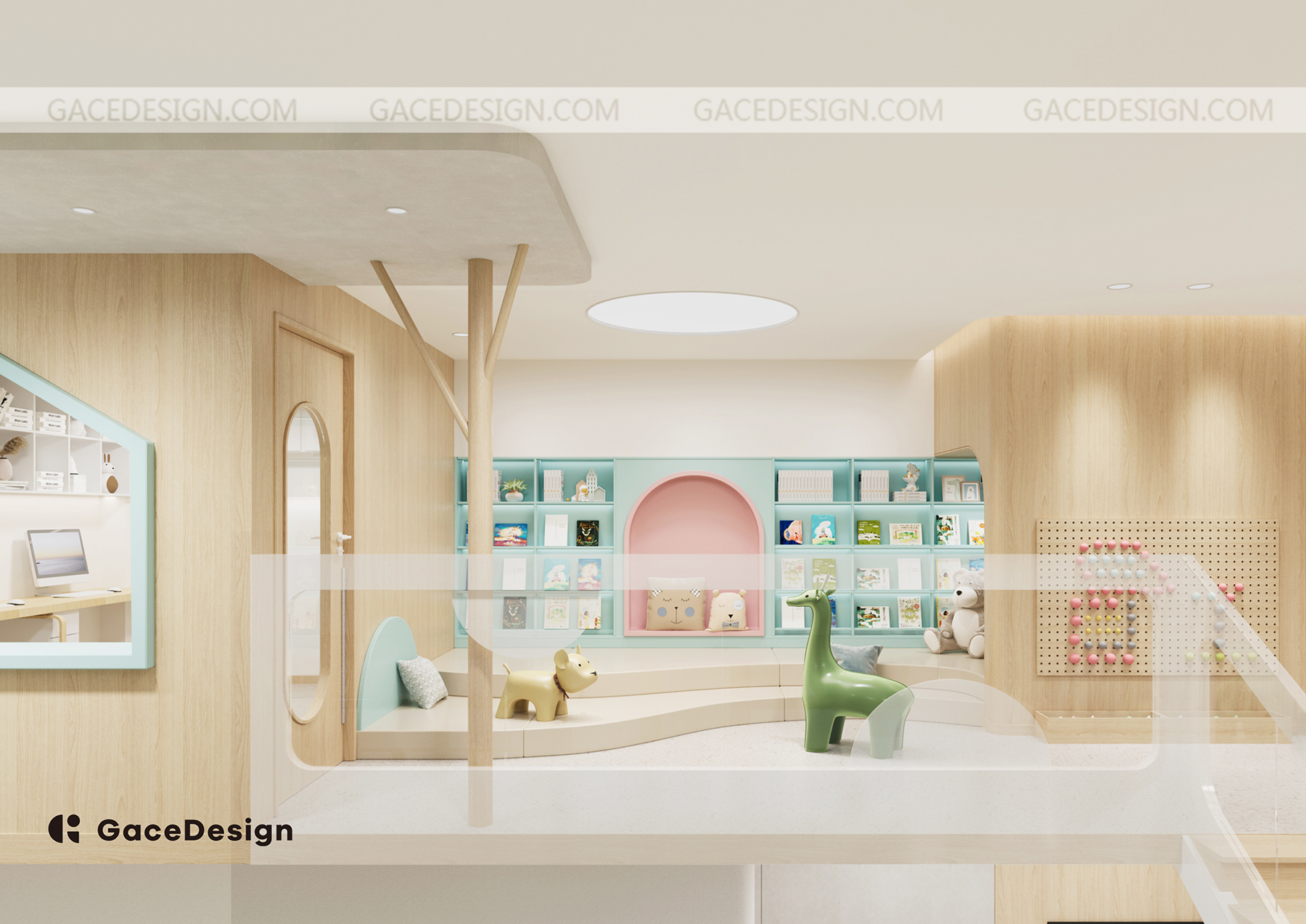 設計闡述:設計靈感來自于品牌名“Giraffe Mommy 長頸鹿媽咪日托中心”,其品牌示意可以聯想到到草原和森林中長頸鹿媽咪和一群生活在森林中的小人兒們,長頸鹿也被稱為“樹之精靈”,它們通常生活在群體中,被稱為“塔”。塔內的長頸鹿之間會互相社交和幫助,成為了默契的伙伴。設計師將這些元素刻畫在空間中,一個能承載各種活動的開放式大廳,枝繁葉茂的大樹屹立在大廳中,森林里帶著俏皮的木屋,空間簡潔舒適。孩子們能從室內看到外面的街道,室外的人也能瞧見室內活動的樣子。在舒適的開放性空間生活的同時,也能感受到和附近區域環境以及社區的羈絆。