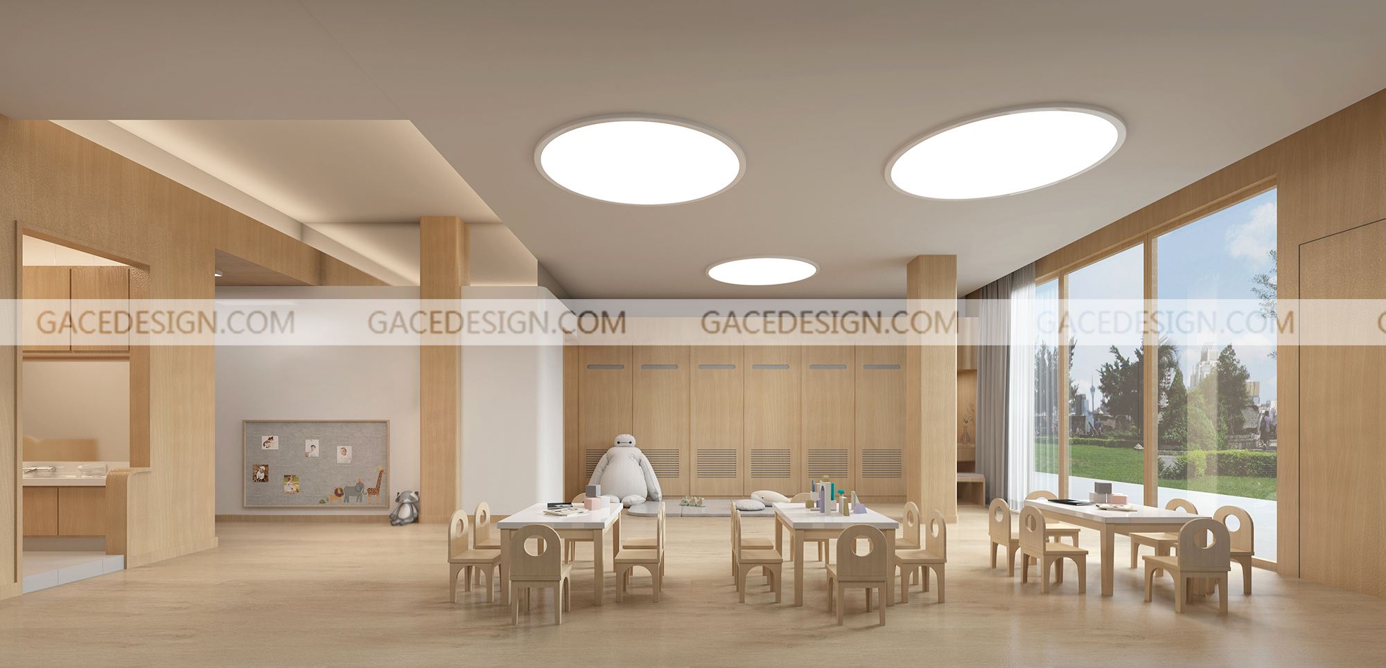設(shè)計(jì)思考:首先擺在我們面前的是要解決通風(fēng)和采光問題。作為家長對(duì)于空間的要求,除了安全以外,最在意的就是通風(fēng)和采光。在室內(nèi)采用了兩種視角,即成人和小孩的視野,場(chǎng)地一共設(shè)計(jì)了4個(gè)托育班,1個(gè)科學(xué)育兒指導(dǎo)區(qū),其他均是配套功能等。讓成人亦可投入這個(gè)兒童空間,真正地塑造出能讓人安心的空間。新空間在視覺上更加開闊,前廳均有充足的自然光線,環(huán)境明亮且溫暖。從前廳過道到科學(xué)育兒指導(dǎo)區(qū),是一個(gè)眼前一亮的開放性空間。純凈的室內(nèi)空間讓孩子們擁有更多創(chuàng)造的空間。這里能提供街道和社區(qū)科學(xué)育兒指導(dǎo)站建設(shè)指導(dǎo),為街道和社區(qū)指導(dǎo)站運(yùn)作提供支持。所以該空間需要一定的活動(dòng)面積,需要承載開展活動(dòng)、爬行、感統(tǒng)區(qū),游樂繪本等互動(dòng)性功能。我們?cè)噲D打破這種室內(nèi)外一刀切所帶來的生硬的邊界感,通過設(shè)計(jì)我們最大程度的把陽光帶給教室,讓教室形成豐富的多層次視野。配合明亮的落地窗,讓孩子的活動(dòng)空間更加通透。