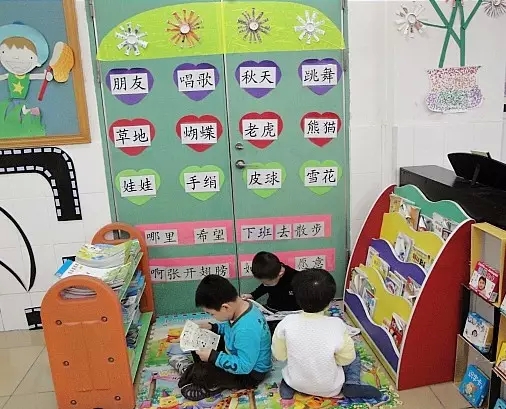 2.語言區:主要功能是通過圖書、圖片、頭飾、手偶等的觀察、操作、拼擺等講述活動,發展幼兒的觀察能力和語言表達能力。