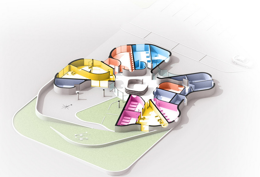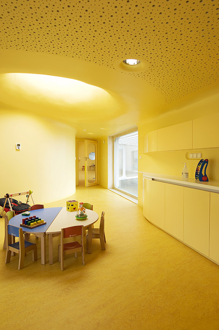 為了保證設(shè)施的安全,所以在內(nèi)部配件的設(shè)計中,消除了所有的直角結(jié)構(gòu),并提供平滑彎曲的邊緣,即使連鋒利的邊緣也被倒圓。這些是該建筑的特點之一,外墻像波浪一樣進(jìn)入了內(nèi)部空間。