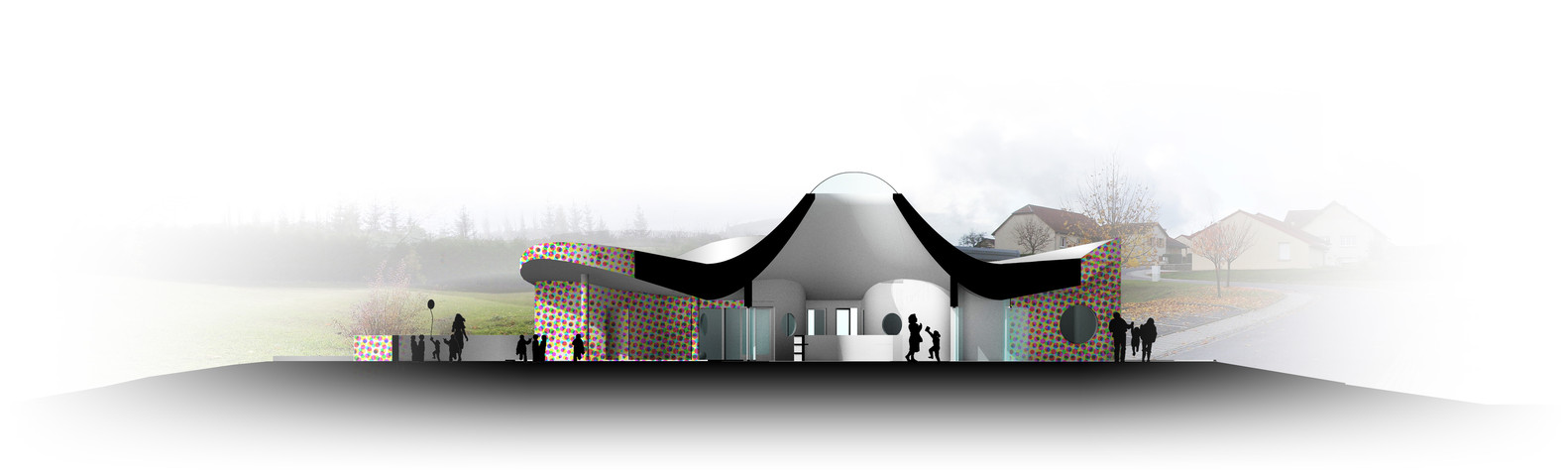 關(guān)于保育設(shè)施的設(shè)計,它是朝南的方位,這給了我們與環(huán)境的無縫集成的設(shè)想創(chuàng)造了一個平臺,我們的想法是讓這個結(jié)構(gòu)自然傾斜。每個平臺對應(yīng)像花園,游樂場,教育花園等功能...設(shè)施的造型體現(xiàn)了建筑的風(fēng)格,這簡直就像是是其它教育機(jī)構(gòu)所包圍的局面。我們的建筑物具有既不是“主立面”,也不是“背立面”的特點,但作為一個整體,只有一個邊緣,它只有一個美學(xué)上均勻的外觀,其可以從周圍可見。