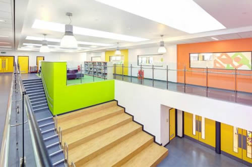 這座建筑的室內(nèi)設(shè)計是在保持教室原貌且敏感地利用室外光線的基礎(chǔ)上設(shè)計的,室內(nèi)有更好的視野,有直接的外部通道,并與建筑中央的廣場相連。中央廣場是一個兩層高的空間,可提供眾多獨(dú)特的學(xué)習(xí)環(huán)境和小教室。這個中央交通流線空間避免了走廊的設(shè)計,每間教室都通過大型玻璃墻與這個廣場相連。廣場的學(xué)習(xí)環(huán)境是建筑師與學(xué)校、甲方團(tuán)隊共同設(shè)計的,目的是保證空間的多樣性——從私密的小組學(xué)習(xí)室到階梯表演空間。這些經(jīng)過仔細(xì)考慮的學(xué)習(xí)空間借用交通流線空間,創(chuàng)造了額外的學(xué)習(xí)機(jī)會,反映了Park Brow社區(qū)小學(xué)的教學(xué)風(fēng)氣。