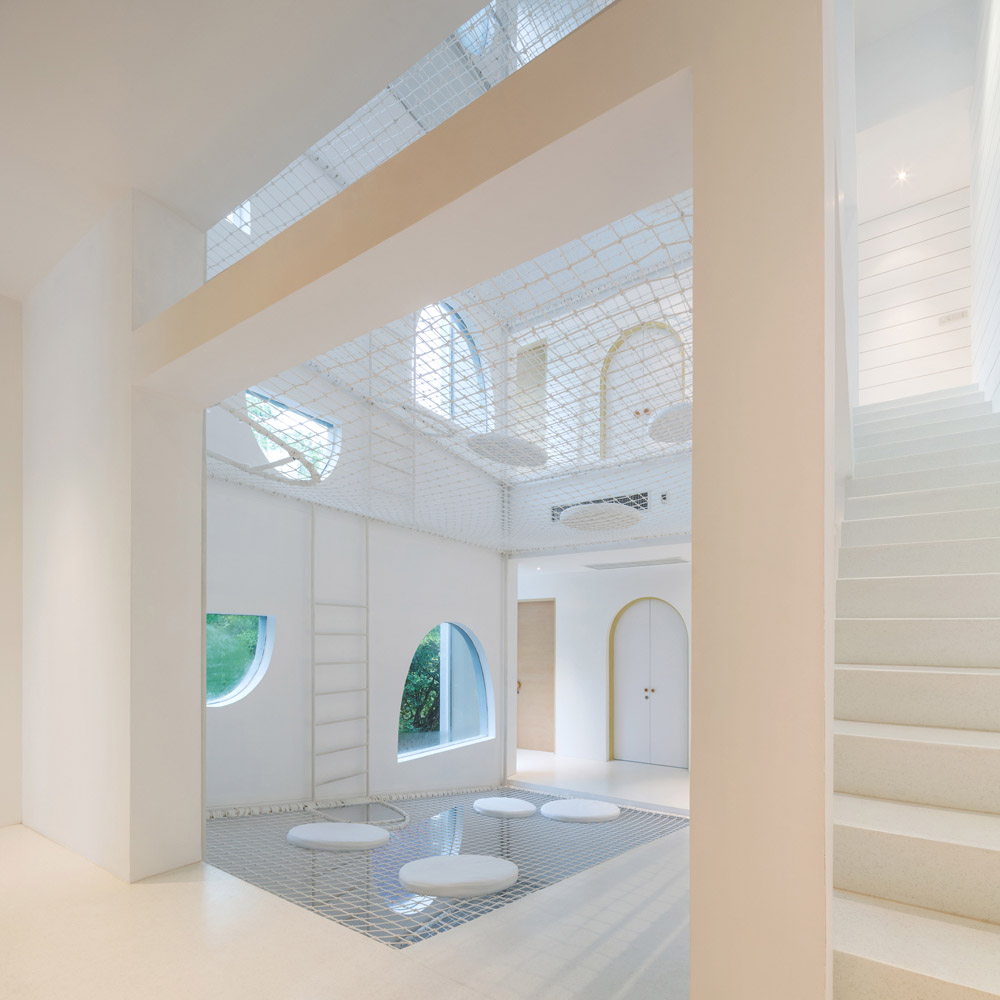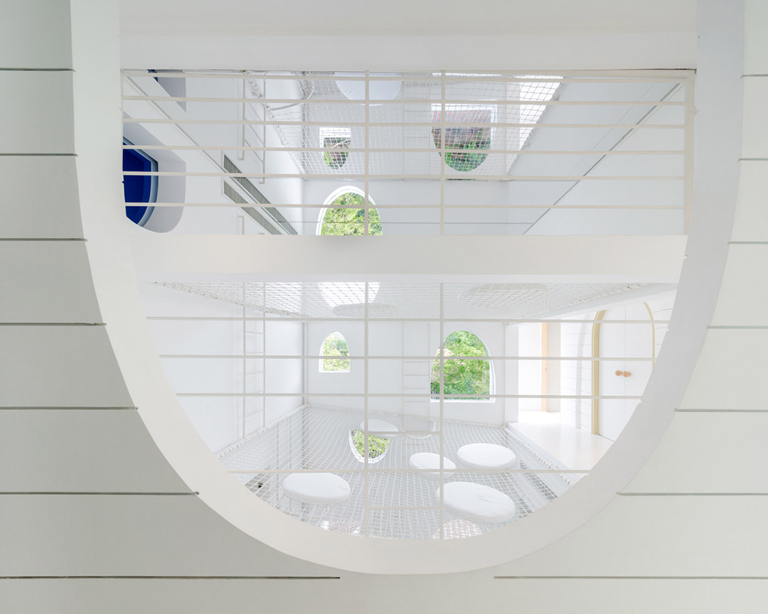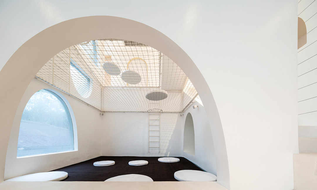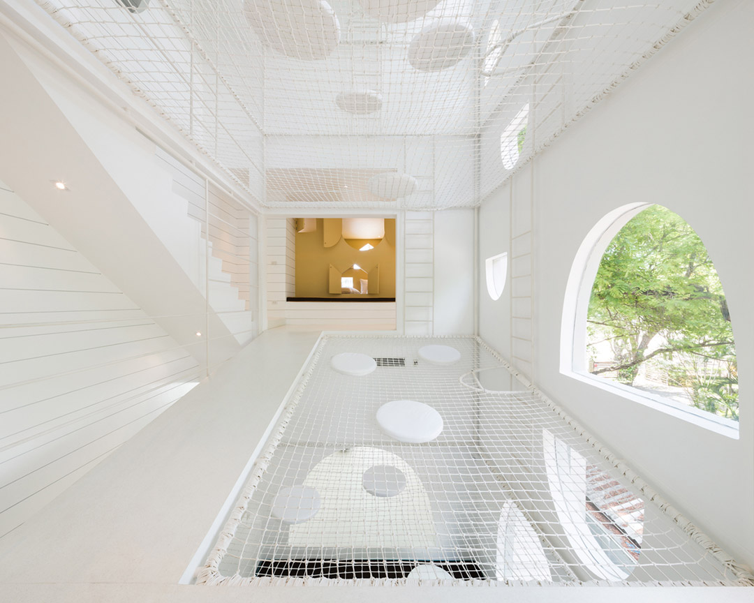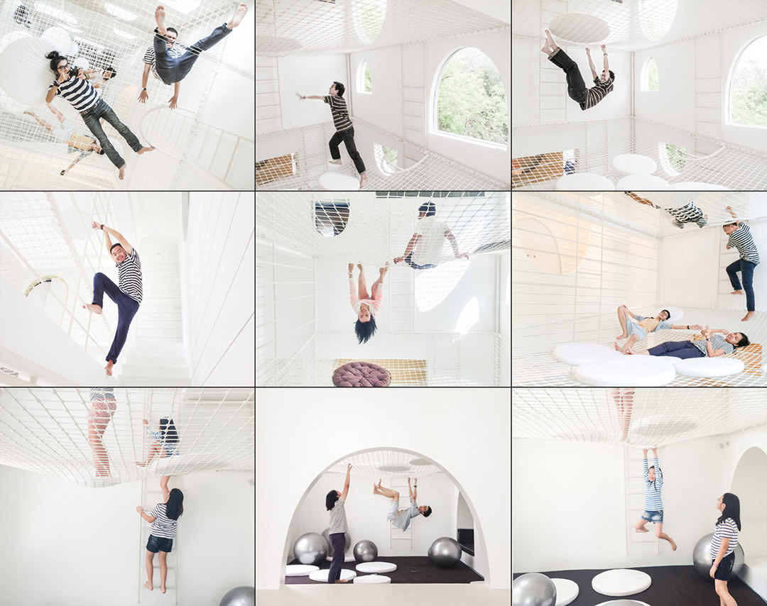 由于有下層繩網的保護,孩子們跳出床外或掉進孔洞都不會產生危險。懸吊在繩網上成為一種新玩法。抬頭看向天花板上的鏡面時,吊掛在繩網上的人似乎懸浮在空中,層疊的網層看起來比它們實際的高度更高。