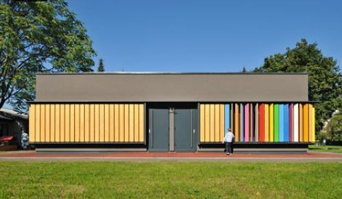 游戲室的一面墻與主樓相接,另外三面墻壁全部由木板組成,這些木板就如同百葉窗的葉片,可以繞著中央的金屬軸轉(zhuǎn)動(dòng)。木板的一面保留木材的原色,另外一面總共刷上了9種鮮艷的顏色,拼在一起就像是彩色的琴鍵。