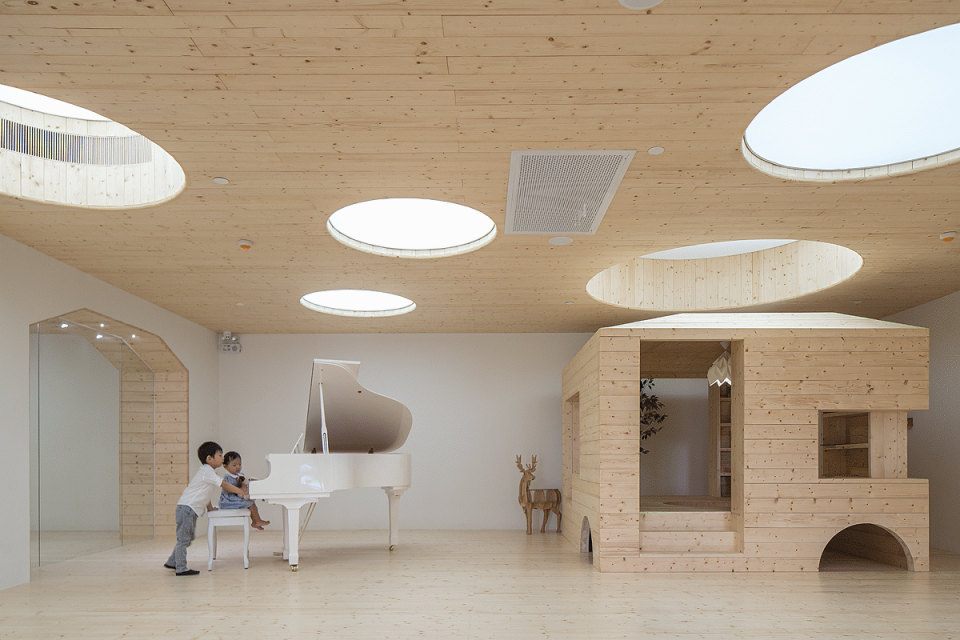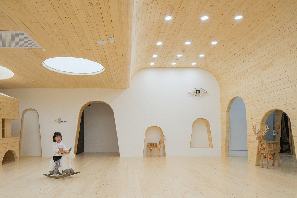 早教中心的設(shè)計分為地下室,一樓和二樓,地下室是老師們辦公和家長培訓(xùn)的地方,一樓是孩子和家長們的公共區(qū)域,采用白松木把地板和天花板的連續(xù)面包裹。這個空間就是孩子們被保護在世界的中心的小木屋,有個拱門去引導(dǎo)孩子們拾階而上,有飛鳥掠過,有樹屋還有鮮花和明燈,之后是教室,其實更像是一個新世界的小角落,讓孩子們?nèi)ヌ剿髦R。這就是寶媽精心打造的兒童空間。