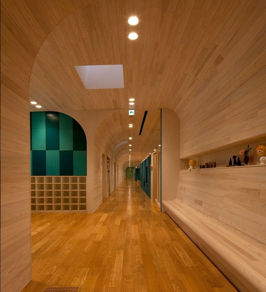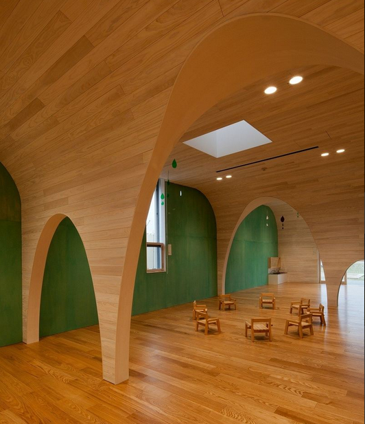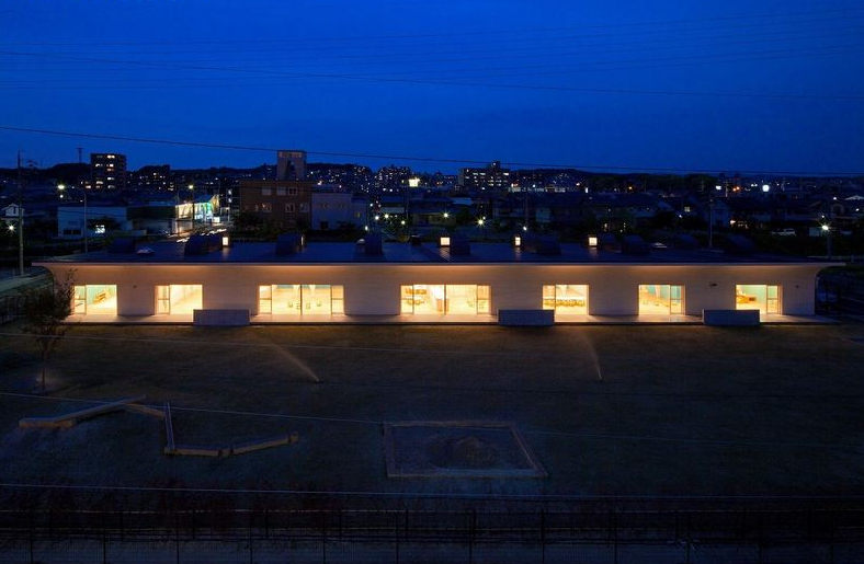 一所位于日本愛知縣張地區的旭城這是給五歲一下的一百多個孩子使用的幼兒園,在過去很多的幼兒園中孩子們的日常活動就像是吃飯玩耍和上廁所或者是睡覺都會是在分開的各個室內進行的,然后設計師的目標是想在一種連續時間狀態下去捕捉孩子的這些活動,并在這個時間容器中布局建筑以及藝術繪品,共同創造出好似一個立體圖畫書般的幼兒園。(幼兒園室內設計