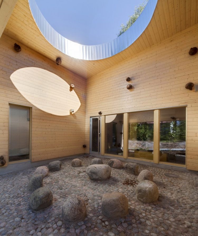 整個建筑鋪砌一新的內部庭院朝向門廳開放,會內的天花板上有一個巨大的露天圓形開口,隨著時間的推移使得移動的陽光成為了室內庭院中一道亮麗的風景,庭院內還有這藝術家創作由20個落葉松木制作的球體組成,代表著宇宙的雕像。(幼兒園室內設計