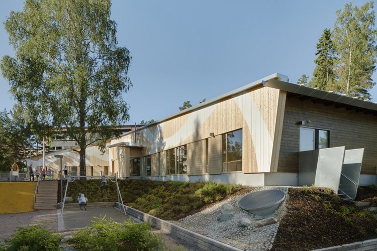 Omenapuisto日托中心位于芬蘭赫爾辛基,整個建筑主要的由單層體量構成,兩層高的部分是一個多功能的高挑空間,并且在這個空間設計有著一個通風裝置室和陽臺,整個建筑所在場地非常狹窄,項目的目標是打造輕盈開放的體量,屋頂吵兩個方向緩緩傾斜每一端都有一個大水槽將雨水排放到石頭鋪砌的水池中,并由此滲入地面,場地內水平高度的自然差異被用作坡道,與相鄰的道路形態相呼應。(幼兒園設計